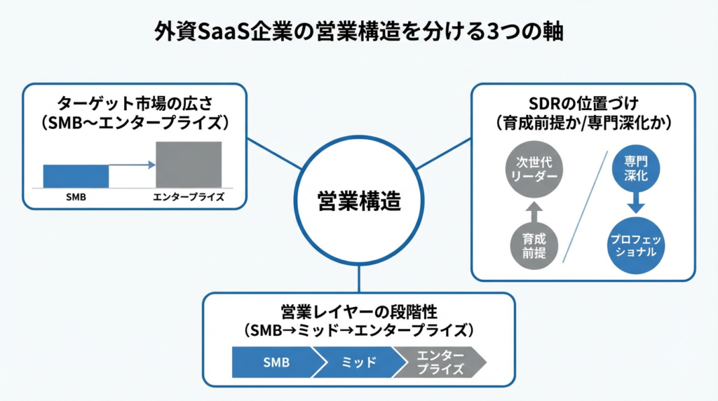 外資SaaS企業の営業構造を理解するために、本稿では三つの軸を用いる。