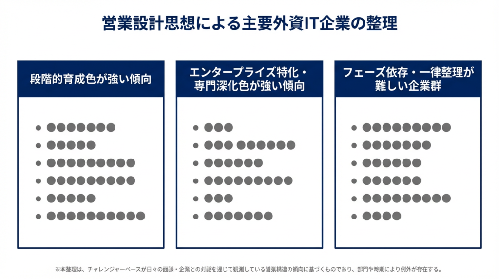 ここでは、営業設計思想ごとに主要企業を整理した。