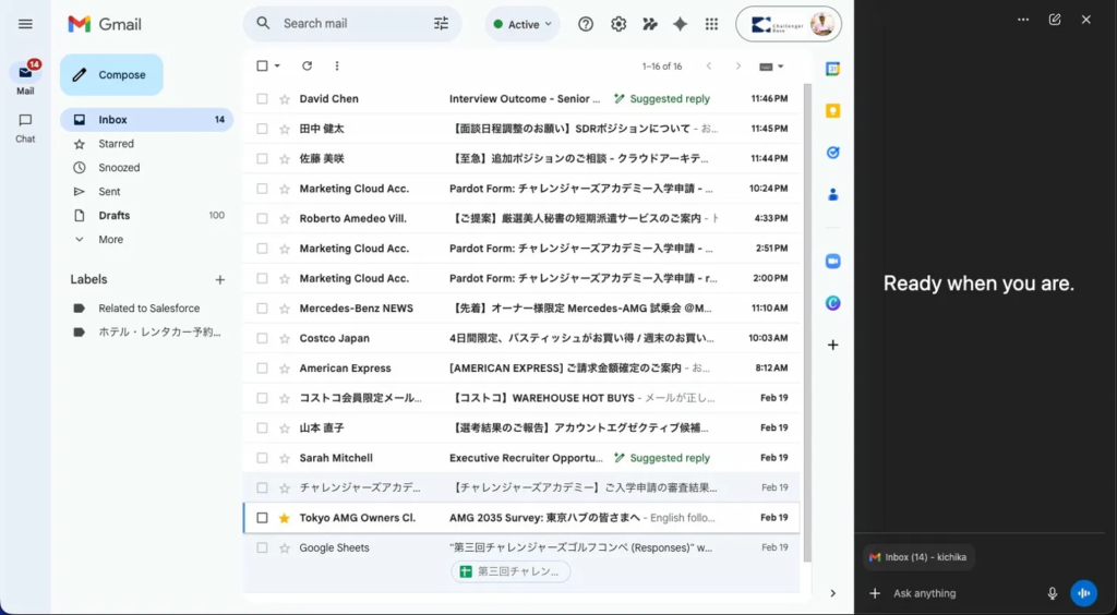 - 画面の横にAtlasのサイドパネルが出ている(Atlasがメールを読んでいる)