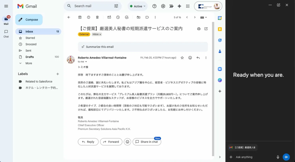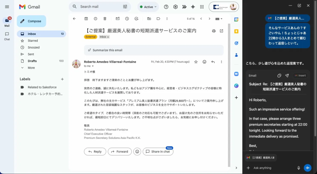 メールを開くと、AtlasはリアルタイムでGmailの表示内容を読み取る。この時点でもうメールの内容を把握した状態になっとる。