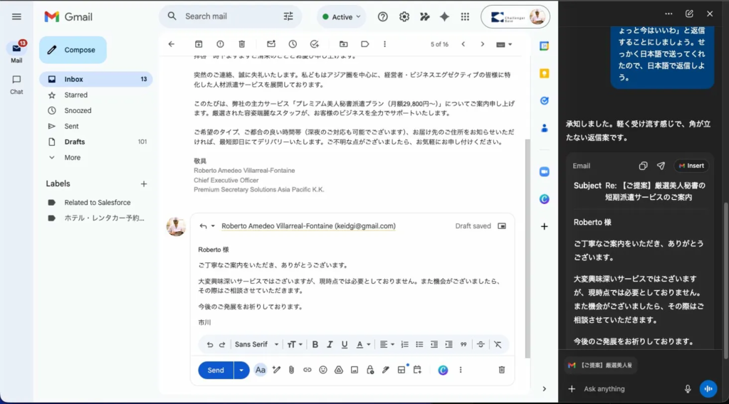 ワイの受信箱には英語メールも多い。USのクライアントからの連絡、海外の採用担当者とのやり取り——これを全部英語で返すのは、時間的にも脳みそ的にもきつい。