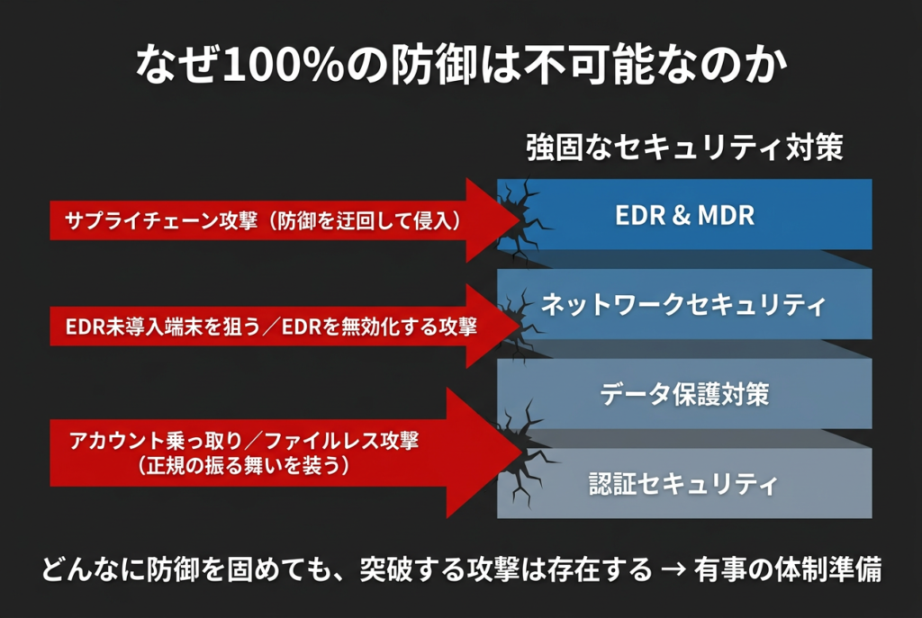 どれだけセキュリティを固めても、取引先経由で侵入されたり、EDRを回避する手法を使われたりする。もう**「100%の防御は無理」というのが業界の共通認識**や。