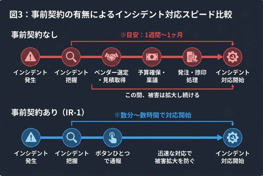 そして恐ろしいのが、対応の遅れがそのままコストに直結すること。事前にインシデント対応の契約を結んでいなかった場合、攻撃を受けてから「ベンダー選定→見積取得→予算確保→稟議→契約」と進めるだけで1週間から1ヶ月。その間にも被害は拡大し続ける。